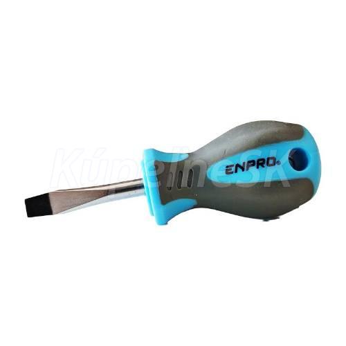 plochý krátky skrutkovač ENPRO kovový stopka vyrobená z veľmi kvalitnej chrom-vanádiovej ocele kalený hrot je magnetický a povrchovo chránený tvrdochromom ergonomicky tvarovaná rukoväť (zložená z polypropylénu a gumičky) zaručuje vynikajúce antisklzové vlastnosti