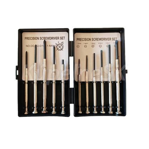 sada najpoužívanejších tvarov hrotov a veľkostí skrutkovačov pre jemnú mechaniku a optiku