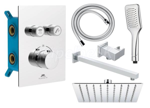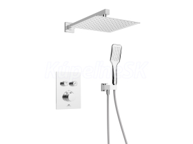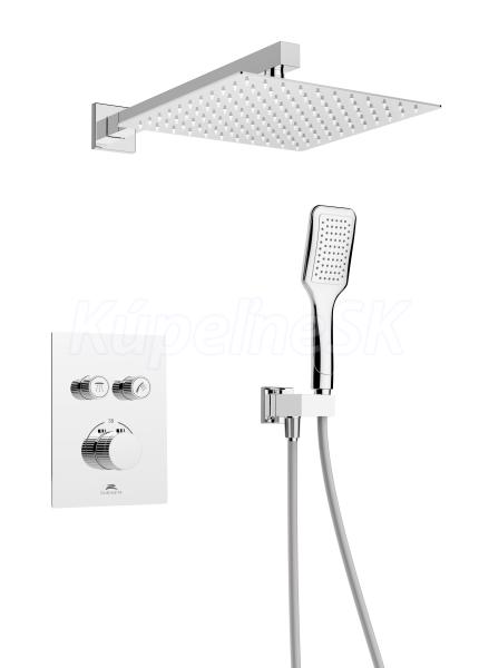 Termostatický podomietkový sprchový set Thermo-2F-OLO (SQ) má jednoduchý dizajn a je tvorený prvotriednymi materiálmi. Vďaka minimalistickému nástennému ovládaciemu panelu umožňuje ľahké prepínanie medzi dažďovou sprchou a ručnou sprchou s presnou reguláciou teploty vody. Set sa skladá z batérie s 2-polohovým prepínačom a vrátane podomietkového boxu, hlavovej sprchy (250x250 mm) s držiakom (400mm), drzákom ručnej sprchy, ručná sprcha (DOVE 1-funkčná), PVC sprchovej hadice .