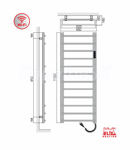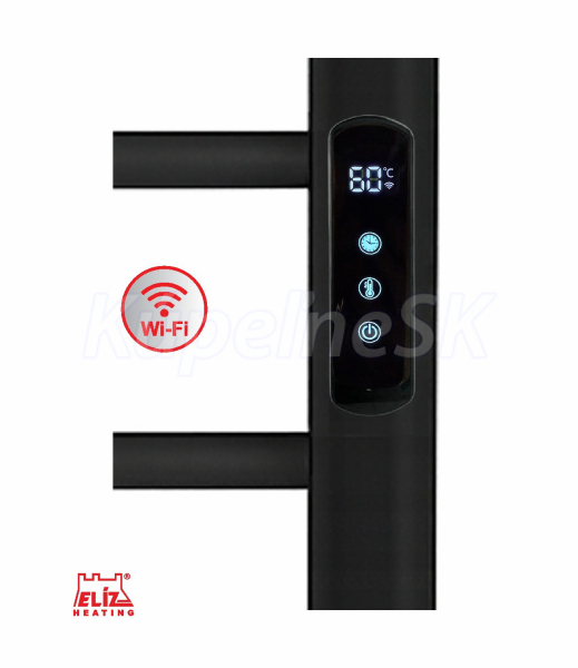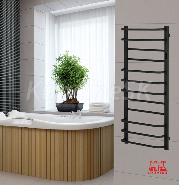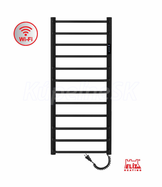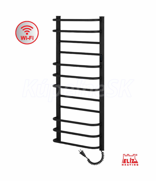 ELÍZ EBS 12/55 AF-B WIFI Vykurovanie | Infrapanely, kúpeľňové radiátory a sušiaky Elektrický sušiak, príkon 229 W, čierna matná farba, zabudovaný ohrievací vodič, elektronické ovládanie teploty s funkciou WIFI, časovač zaponutia/vypnutia, krytie IP44, automatické vypnutie pri prehriatí. Elektrický sušiak ELÍZ, model EBS 12/55 AF-B WIFI