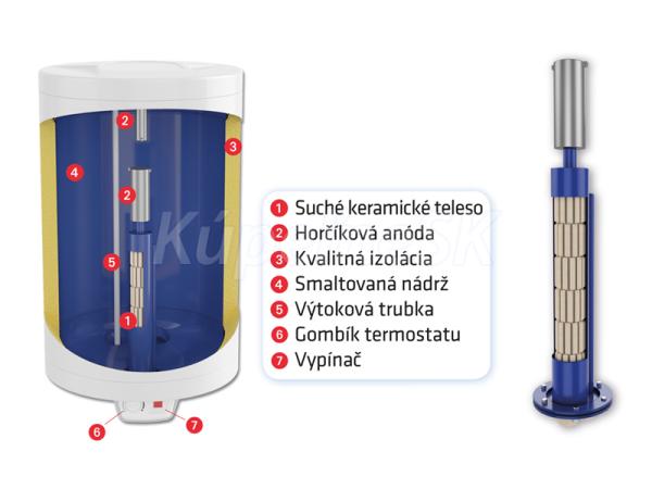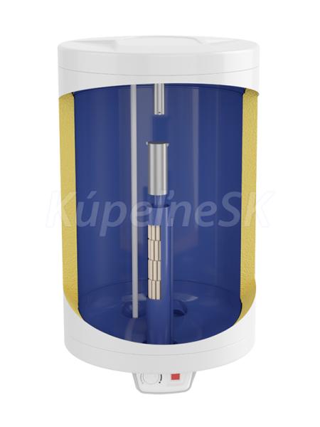 Nádrž ohrievača vody je vyrobená z kvalitnej ocele chránená vrstvou zirkónového smaltu. Kvalitná polyuretánová izolácia bez CFC hrúbky 43 mm zaručuje nízke tepelné straty a úsporu nákladov na ohrev vody. Pomocou termostatu umiestnenom na ovládacom paneli viete nastaviť teplotu vody v rozsahu 7 - 75°C, s možnosťou nastavenia režimu ECO. Pri nastevní v režime ECO sa voda ohreje na optimálnu teplotu 55°C, so zníženými tepelnými stratami a nižšou spotrebou elektrickej energie. Minimálna hodnota termostatu slúži ako ochrana proti zamrznutiu vody v ohrievači. Ohrievač má zabudované dve anódové tyče, ktoré garantujú efektívnu ochranu nádrže proti korózii a výrazne predlžujú jej životnosť. Vypínač so svetelnou kontrolkou ohrevu slúži k zapnutiu / vypnutiu ohrievača v prípade našej neprítomnosti, čo umožňuje úsporu energie.