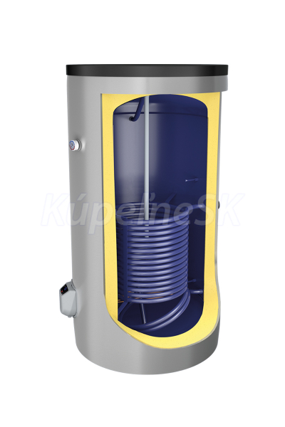 ELÍZ EURO 300 S1 Zásobníkové ohrievače | Stacionárne s 1 hadom Solárny stacionárny ohrievač vody, objem 300 litrov, 1 výmenník, elektr. ohrievacie teleso 6 kW, cirkulácia, energetická trieda B. EURO 300 S1 je stacionárny, na zemi stojaci, ohrievač vody s objemom 300 litrov. Ohrievač má zabudované elektrické ohrievacie telesá s príkonom 6 kW a je vybavený jedným vykurovacím výmenníkom na pripojenie externého teplovodného zdroja, napr. kotla ÚK alebo solárneho systému.