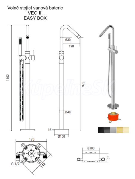 Vaňová stojanková batéria je dodávaná vrátane príslušenstva ( inštalačného box pre jednoduchšiu inštaláciu, sprchová ružica a hadica) . Dodávame v piatich farbách a to chróm, čierna , grafitová alebo zlatá, zlatá lesklá, zlatá brúsená.