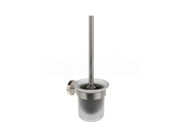 Nástenný držiak s WC kefou a nádobkou Kona. V prevedení kefovaná nerez a matné sklo.