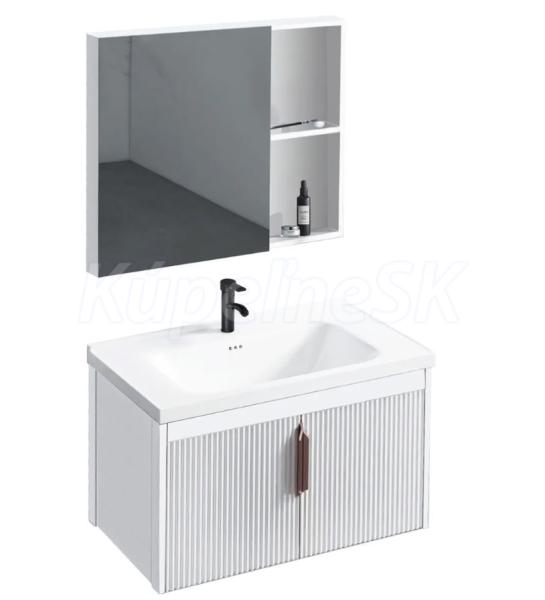Funkčný a moderný kúpeľňový nábytok predstavuje hotové riešenie na vytvorenie praktickej umývadlovej zóny. Súčasťou zostavy je závesná skrinka s keramickým umývadlom a skrinka so zrkadlom a bočnými poličkami, ktoré uľahčujú uskladnenie každodennej kozmetiky.