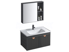 Funkčný a moderný kúpeľňový nábytok predstavuje hotové riešenie na vytvorenie praktickej umývadlovej zóny. Súčasťou zostavy je závesná skrinka s keramickým umývadlom a skrinka so zrkadlom a bočnými poličkami, ktoré uľahčujú uskladnenie každodennej kozmetiky.