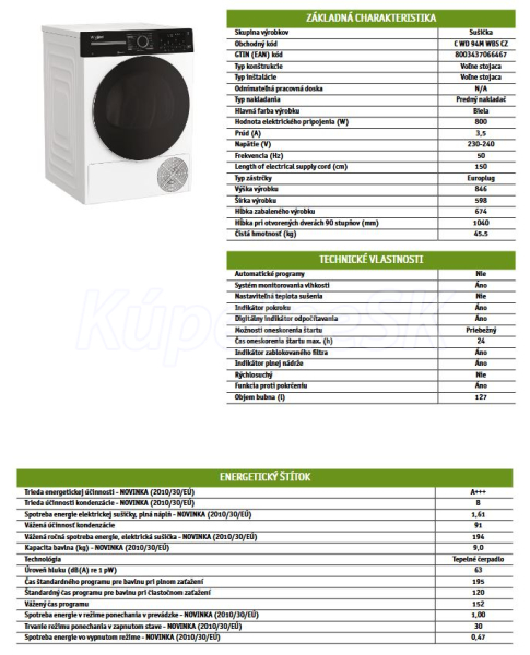 Whirlpool C WD 94M WBS CZ voľne stojaca sušička prádla s tepelným čerpadlom 9 kg Biela