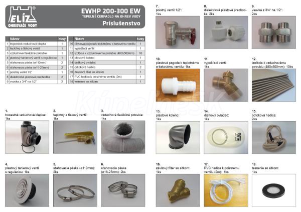 ELÍZ EWHP 300 EW Tepelné čerpadlo na ohrev TÚV, vzduch-voda, objem 300 litrov, COP dwh = 3,47, elektrická špirála 2000 W, digitálna riadiaca jednotka, WIFI. Teplá voda zo vzduchu! Úspora prevádzkových nákladov. Tepelné čerpadlá ELÍZ na ohrev vody spĺňajú najnovšie trendy vo využívaní zelenej energie. Pracujú na princípe vzduch - voda s vysokou triedou energetickej účinnosti A+. Úspešne nahrádzajú klasické elektrické ohrievače vody. Kompaktné čerpadlo 2v1 s nízkym príkonom odvádza energiu priamo z ovzdušia, ktorú kompresor premení na teplo. Vyrobené teplo odovzdá kondenzačnému výmenníku tepla a ten svojou veľkou plochou okolo nádrže ohreje vodu v ohrievači vody. Čerpadlo používa chladivo R134A a doplnkové elektrické teleso 2 kW. Ovládanie tepelného čerpadla Celý proces ohrevu vody riadi digitálna riadiaca jednotka s veľkým dotykovým displejom. Elektronika je riadená jednoduchým a intuitívnym softvérom špeciálne navrhnutým na automatizáciu riadenia ohrevu vody. Tepelné čerpadlo obsahuje modernú funkciu WIFI, takže ho môžete ovládať cez svoje smart zariadenie v pohodlí odkiaľkoľvek. Elektronika umožňuje ohrev vody vo viacerých režimoch:AUTO - kombinácia tepelné čerpadlo a elektrické ohrievacie teleso (čerpadlo samo zhodnotí potrebu v prípade teplotných výkyvov)ECO - len tepelné čerpadloFAST - intenzívny ohrev (použitie tepelného čerpadla a elektrického telesa súčasne pre ešte rýchlejší ohrev vody)Teplota vody pri ohreve tepelným čerpadlom je 55°C, pri doplnkovom ohreve elektrickou špirálou až 75°C. Elektronika na displeji zobrazuje prevádzku tepelného čerpadla, teplotu vody v nádrži ohrievača a tiež aj všetky systémové a chybové správy (ak nastanú). Poskytuje širokú škálu nastavení prevádzkových parametrov, nastavenie časovačov ohrevu vody a zobrazenie štatistík. Nádrž ohrievača vody je vyrobená z kvalitnej ocele chránená vrstvou zirkónového smaltu. Kvalitná polyuretánová izolácia bez CFC hrúbky 50 mm zaručuje nízke tepelné straty a zvyšuje tým úsporu nákladov na ohrev vody. Výhody produktu: Energeticky efektívny - nízke prevádzkové náklady Vysoký koeficient výkonnosti - COPDWH 3,47 (pri vonkajšej teplote 20°C) Efektívna prevádzka počas všetkých ročných období Jednoduchá inštalácia v interieri Inovatívna konštrukcia kondenzačného výmenníka tepla- hliníkový výmenník tepla s veľkou plochou okolo nádrže Inštalované elektrické ohrievacie teleso s príkonom 2000 W Maximálna teplota pri ohreve tepelným čerpadlom je 55°C Pri doplnkovom ohreve elektrickou špirálou až 75°C Digitálna riadiaca jednotka s viacerými režimami ohrevu- ovláda a spoľahlivo pracuje pre každý okruh: tepelné čerpadlo, elektrické teleso Nastavenie teploty vody v rozsahu 20 - 75°C Elektronický termoregulačný ventil Diagnostika a hlásenie chybových správ Protimrazová ochrana, Ochrana proti prehriatiu Ochrana proti baktériam Anti-Legionella ovládanie cez WIFI Návod na obsluhu, Technický list