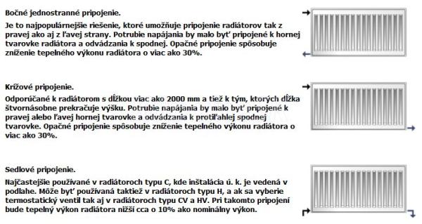 Panelové radiátory s konvekčnými prvkami, bočné povrchy pokryté krytmi, vrchný povrch je pokrytý krytom typu grill. Štyri bočné prípojné otvory v každom rohu radiátora s vnútorným závitom 1/2”.