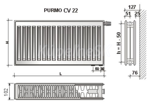 Panelové radiátory s konvekčnými prvkami a zabudovaným termostatickým ventilom, bočné povrchy pokryté krytmi, vrchný povrch prikrytý krytom typu grill. Zabudovaná prípojná zostava umožňuje napájanie radiátora zo spodu ako aj z boku. Dva dolné prípojné otvory na napájanie od podlahy a štyri bočné prípojné otvory v každom rohu radiátora. Všetky otvory s vnútorným závitom1”. Napájanie od podlahy v radiátoroch CV11 štandardne z pravej strany. V radiátoroch CV22 a CV33 môže byť taktiež z ľavej strany po obrátení radiátora. Potrubie napájania radiátora by malo byť pripojené vždy ďalej od okraja radiátora, avšak spätné potrubie bližšie k okraju radiátora. Radiátor obsahuje ventilovú vložku Heimeier alebo Oventrop so vstupnou reguláciou.