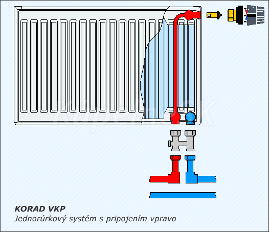 Radiátor typ Ventil-Kompakt (VK) je dodávaný so špeciálnou garnitúrou pre spodné pripojenie a ventilovou vložkou s prestaviteľnými hodnotami kv. Základný modelový rad radiátorov so 4-bodovým bočným pripojením a tvarovaným panelom s vertikálnymi kanálikmi. Súčasťou radiátora sú bočné kryty a vrchná mriežka. Od dĺžky 1700mm majú radiátory navarené 3 dvojice závesných držiakov. Povrchová úprava výrobkov KORAD pozostáva z troch základných krokov: 1.chemická predúprava - odmastenie, fosfátovanie. 2. 10 - 18 µm kataforeticky nanesená základná farba vypaľovaná v peci pri teplote 140°C po dobu 40 minút , 3. 60 - 80 µm elektrostaticky nanesená prášková farba vypaľovaná v peci pri teplote 180°C po dobu 20 minút.Panel radiátora je zvarený z dvoch výliskov, po obvode švovým zvarom. Panelové radiátory KORAD sú učené do vykurovaných priestorov s nízkou relatívnou vlhkosťou (30 - 60%) byty, kancelárie, školy, hotely, obchody, múzeá a pod. Panelové radiátory je najvhodnejšie situovať min. 140 mm pod okenný parapet do zvislej osi okna vo výške min. 70 mm od podlahy. Montáž radiátorov doporučujeme vykonávaťť v zabalenom stave, čím sa zabezpeeí maximálna ochrana radiátorov až do ukončenia všetkých stavebných prác. Na čistenie radiátora je možné použiť čistiace prostriedky určené na čistenie lakovaných povrchov. Nepoužívajte abrazívne čistiace prostriedky ani prostriedky obsahujúce chlór a kyseliny. ZÁRUKA 10 rokov.