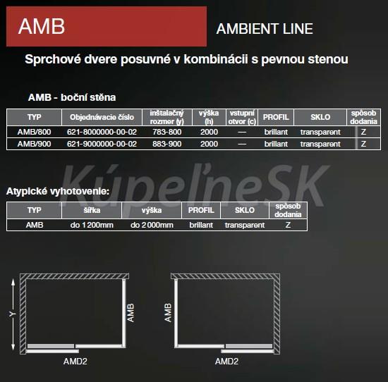 Roltechnik AMB 90x200cm samotná pevná bočná sprchová stena k sprchovým dverám AMD2, profil Brillant (leštený hliník), výplň 8mm transparentné kalené bezpečnostné sklo s povrchom Nanoglass. Univerzálne ľavé/pravé prevedenie. Stena je určená na kombináciu so sprchovými dverami AMD2 - možnosť vytvorenia atypického rohového sprchového kúta.