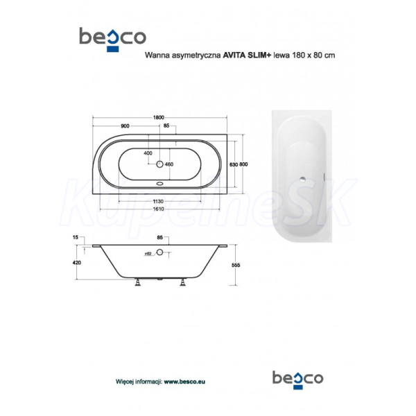 Dizajnová asymetrická vaňa AVITA SLIM + so zaoblenými krivkami s veľmi nízkou hranou (iba 15 mm) . Táto vaňa je vhodná ako do malých , tak ale aj do veľkých kúpeľní. Vaňa ponúka obojstranné veľmi pohodlné ležanie a prepad s pozdĺžnou štrbinou . Vaňový sifón je v cene vane. Nožičky k vani je nutné dokúpiť. Túto vaňu je možné za príplatok objednať s povrchovou úpravou BeSafe* .