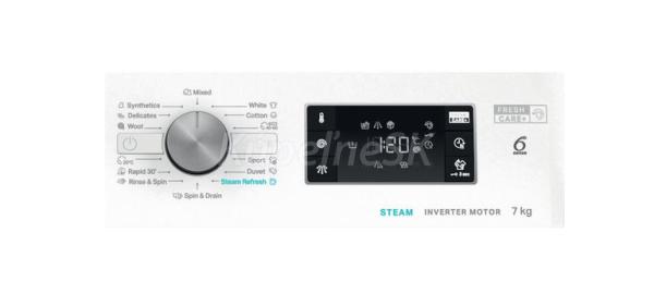 Práčka spredu pl., 7 kg (bubon 54 l), 1200 ot. (B), energ.tr. A (45 kWh/100 cyklov), spotr.vody 45 l, hlučnosť C (77 dB), bezuhlíkový motor, veľký digitálny displej; Freshcare+, Steam Refresh (osvieženie parou), Čistenie+ (možnosť skrátiť program), biela + čierny rám dverí, ovl. panel s anglickým textom; 10 rokov záruka na motor