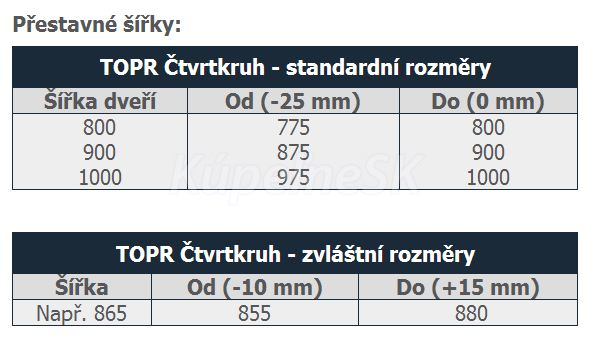 Sprchové kúty TOPR sú štvrťkruhové kúty s dvojkrídlovými dvermi s otváraním von.