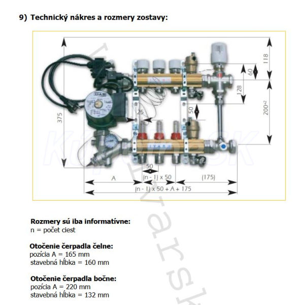 - zostava obsahuje: rozdeľovač s regulačnými prietokomermi, zberač s uzatváracími ventilmi, upevňovacie konzoly, termostatický ventil s termostatickou hlavicou a oddeleným ponorným teplotným čidlom k regulácii na konštantnú teplotu a BY-PASSom, regulačné šróbenie, obehové čerpadlo s elektroinštaláciou, poistný termostat, 2 ks automatických odvzdušňovacích ventilov, teplomer, 2 ks otočných vypúšťacích ventilov a inštalačná skriňa príslušnej veľkosti