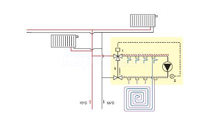 - zostava obsahuje: rozdeľovač s regulačnými prietokomermi, zberač s uzatváracími ventilmi, upevňovacie konzoly, termostatický ventil s termostatickou hlavicou a oddeleným ponorným teplotným čidlom k regulácii na konštantnú teplotu a BY-PASSom, regulačné šróbenie, obehové čerpadlo s elektroinštaláciou, poistný termostat, 2 ks automatických odvzdušňovacích ventilov, teplomer, 2 ks otočných vypúšťacích ventilov a inštalačná skriňa príslušnej veľkosti