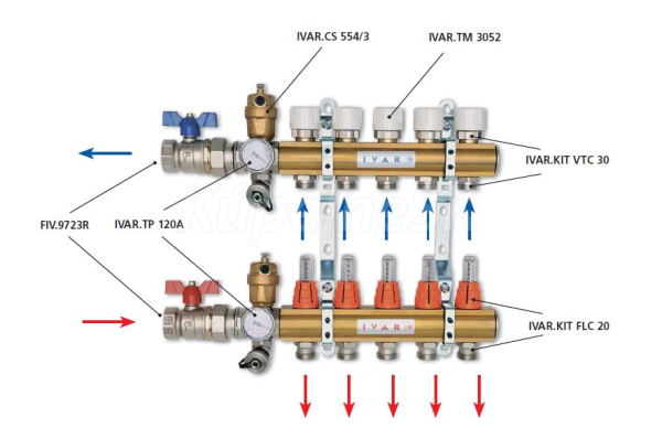 - zostava obsahuje: rozdeľovač s regulačnými prietokomermi, zberač s uzatváracími ventilmi, upevňovacie konzoly, 2 ks guľových uzáverov so šróbením, 2 ks priechodných medzikusov s automatickým odvzdušňovacím ventilom, otočným vypúšťacím ventilom a teplomerom, 2 ks zátky, inštalačnú skriňu príslušnej veľkosti
