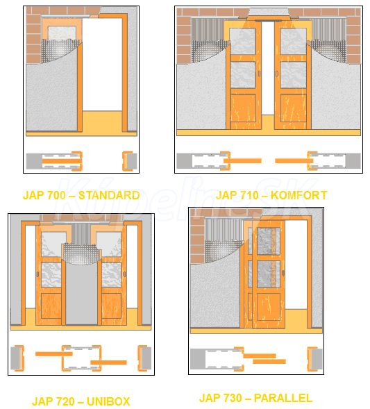 DVERE POSUVNÉ DO STAVEBNÉHO PUZDRA JAP a ZÁRUBEŇ obsahujú kompletnú dodávku potrebnú k ich priamej montáži do pripraveného stavebného puzdra.