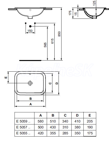 Ideal Standard E505501 CONNECT Umývadlo Zápustné Hranaté 42cm,Bez otvoru pre batériu