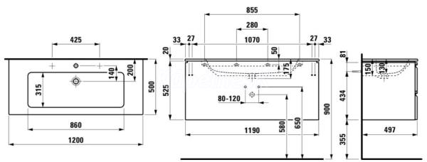 Laufen Pro skrinka s 2 zásuvkami s umývadlom slim s otvorom pre batériu v strede, glazovaný okraj umývadla