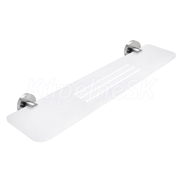 Police s frézovanými otvory. Materiál plexiglass s matným povrchem. Délka 60 cm. Úchyty broušená nerez.