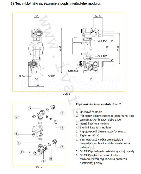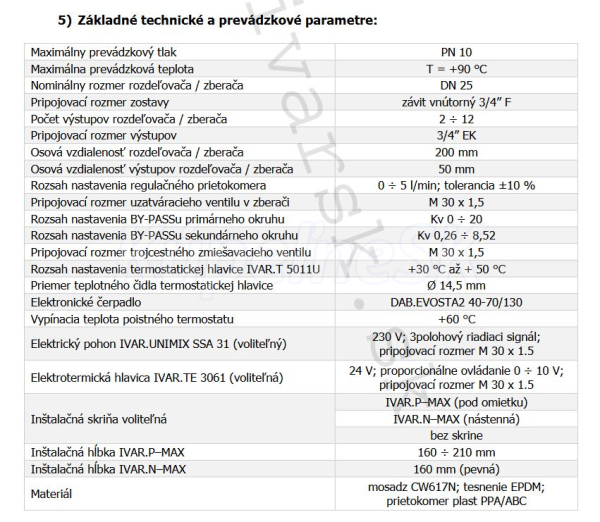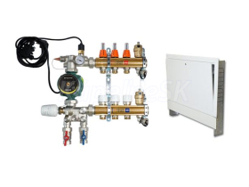 - univerzálny riadiaci a čerpadlový modul s obehovým čerpadlom a integrovaným trojcestným zmiešavacím ventilom s alternatívnymi možnosťami ovládania, vyvažovacím regulačným šróbením a nastaviteľným BY-PASSom prietoku, termostatickú hlavicu s oddeleným ponorným teplotným čidlom k regulácii na konštantnú teplotu, rozdeľovač s regulačnými prietokomermi, zberač s uzatváracími ventilmi, upevňovacie konzoly, poistný havarijný termostat, teplomer, 2ks automatických odvzdušňovacích ventilov, 2 ks otočných napúšťacích ventilov, 2 ks guľových uzáverov so šróbením, 2 ks zátky a inštalačnú skriňu príslušnej veľkosti