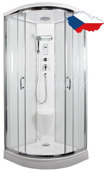 Klasický štvrťkruhový sprchovací box vlastnej výroby s posuvnými dverami sa vyznačuje jednoduchým dizajnom, vysokou kvalitou spracovania. Profil je z lešteného hliníka, presklenie z 5 mm bezpečnostného grape skla, zadné sklo super biele nepriehľadné, šírka vstupu 55 cm. Vanička je z liateho mramoru, vlastnej výroby, v bielej farbe. Výroba panelu, predného panela k vaničke a stropu je teraz z kompozitných materiálov, ktoré sa používajú v leteckom priemysle. Voči skôr používané polyesterovej živici je kompozitný materiál ekologickejšie, lepšie spracovateľný a pri rovnakej hrúbke výrobku pevnejšie. Je to tiež dôvod, prečo môžeme dosiahnuť tak dokonalé povrchovej úpravy.