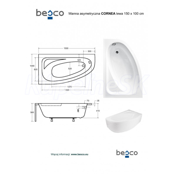 Besco CORNEA Vaňa asymetrická akrylátová 150x100cm Ľavá 157 l, Biela + nohy