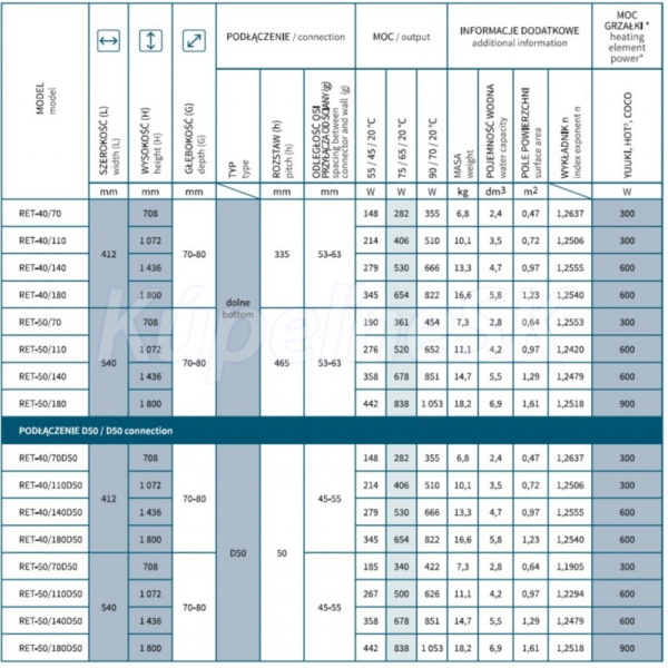 Dostupné rozmery radiátora RETTO do kúpeľne:
