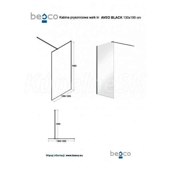 Besco AVEO BLACK Walk-in sprchový kút 130x195 cm,1x vzpera, rám Čierny Al, sk.číre 8mm