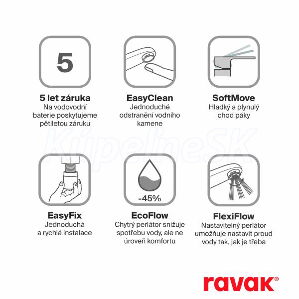 Vo vnútri batérie je dômyselný perlátor s funkciou EcoFlow. Prietok je obmedzený na 5l za minútu a obohatený o vzduch. Pravdepodobne si to ani nevšimnete, ale prejaví sa to na vašej spotrebe vody, ktorá bude nižšia než u bežnej batérie. Pre ucelené riešenie a dizajnový súlad kúpeľne odporúčame kombinovať s ostatnými batériami Eleganta rovnakého farebného prevedenia. Na vonkajšie čistenie odporúčame používať čistiaci prípravok Ravak Cleaner Chrome. Ešte väčšiu úsporu vody a energie ponúka batéria Eleganta EL 015.01 vybavená funkciou BeCool.