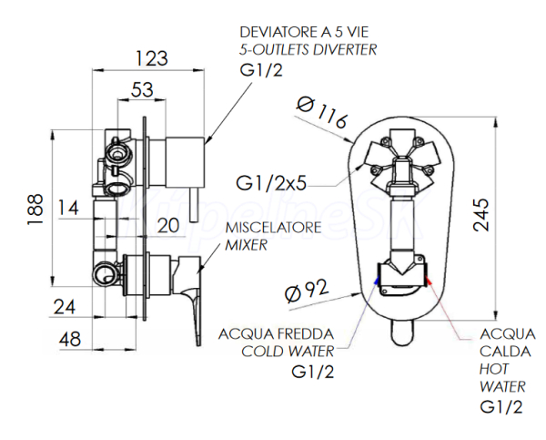 - Sprchová batéria podomietková, bez príslušenstva, s prepínačom, 5 výstupy