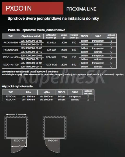 Roltechnik PXDO1N 110x200cm jednokrídlové sprchové dvere do niky, profil Brillant (leštený hliník), výplň 6mm transparentné kalené bezpečnostné sklo s povrchom Nanoglass. Univerzálne ľavé/pravé prevedenie. Možnosť inštalácie do niky alebo kombinácie s pevnou bočnou stenou PXBN.