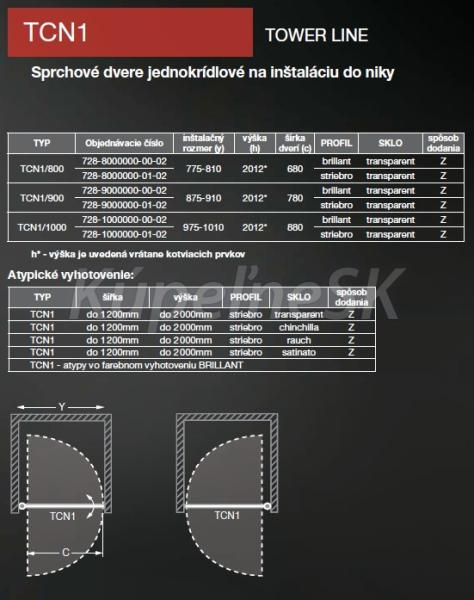 Roltechnik TCN1 100x200cm samotné sprchové jednokrídlové dvere do niky, obojstranné otváranie, výška 200cm, profil Brillant (leštený hliník), výplň 6mm transparentné kalené bezpečnostné sklo s povrchom Nanoglass. Sprchové dvere TCN1 sú určené na inštaláciu do niky, nie je možnosť kombinácie s pevnou stenou.