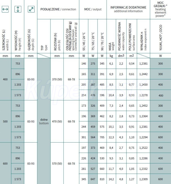 • 600 × 896 mm, výkon 437 W, (vykurovacia tyč 400 W)