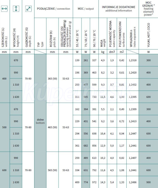 • 400 × 990 mm, výkon 369 W, (vykurovacia tyč 400 W)