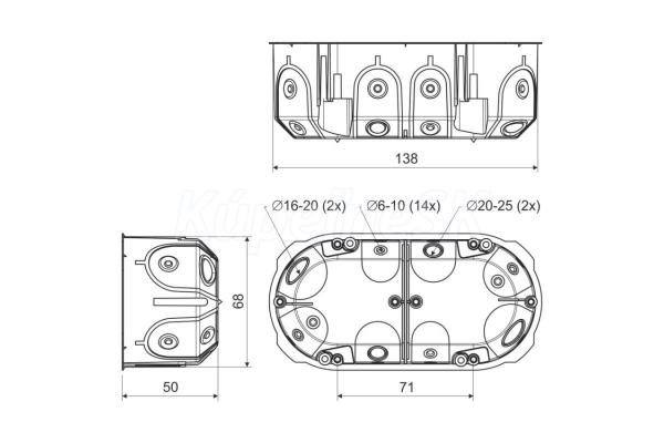 Hĺbka: 50 mm priemer: 68 mm Šírka: 138 mm vnútorná hĺbka: 49 mm pre priemer potrubia: 20/25 mm pre priemer kábla: 6 - 25 mm max. prierez drôtu: 4 mm2