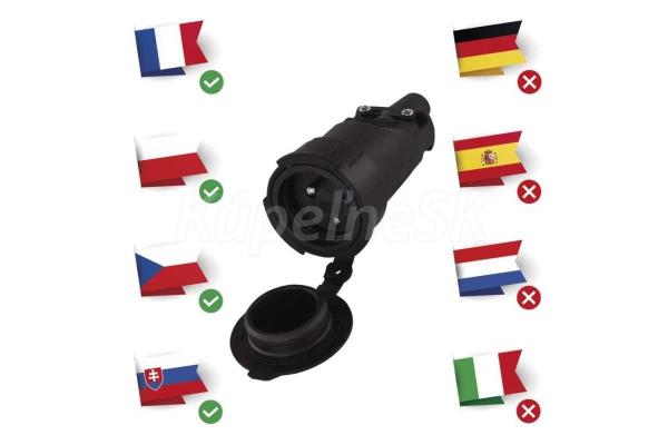 Všeobecný opis: Gumová zásuvka pre pohyblivé prívody, odolná voči striekajúcej vode, je určená na výrobu predlžovacích prívodov alebo ako náhradný diel. Vhodná pre maximálne zaťaženie 16 A max. Popis: V súčasnosti sa nachádza na území Slovenskej republiky: produkt: gumová zásuvka pre pohyblivú zásuvku