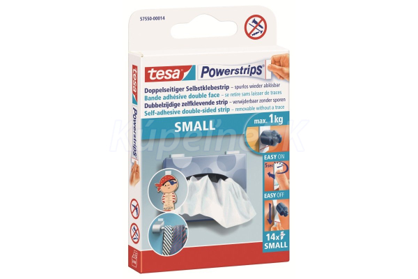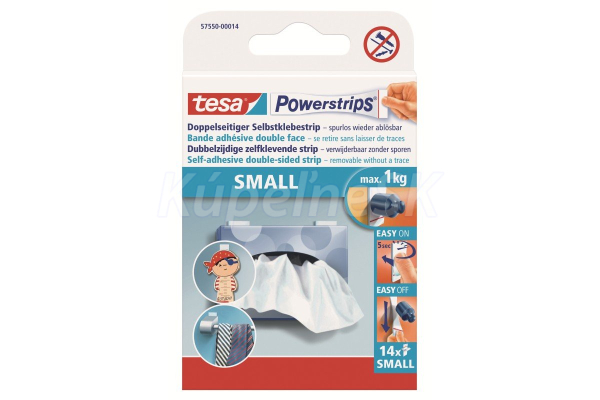 malé obojstranné samolepiace pásky Tesa Powerstrips® penové pásy vhodné na upevnenie menších a plochých predmetov do 1 kg priľne na rovný a dostatočne pevný povrch (nie je vhodný na použitie na polystyrén, penové materiály, povrchy s nepriľnavou vrstvou, porézny materiál) vhodné pre celý sortiment príslušenstva Powerstrips Small farba: biela prídržná sila: 1 kg obsah balenia produktu: 14 prúžkov