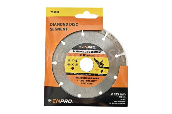 diamantové kotúče prémiovej značky ENPRO, ktorá je zárukou profesionálnej kvality Disky ENPRO sa vyznačujú predovšetkým vysokou kvalitou použitého materiálu a dlhou životnosťou Certifikácia MPA segmentové kotúče sú vhodné na pevnejšie materiály, ako sú: kameň, murivo, betón, zámková dlažba, žula, mramor vhodné na rezanie za sucha aj za mokra priemer otvoru: 22,2 mm