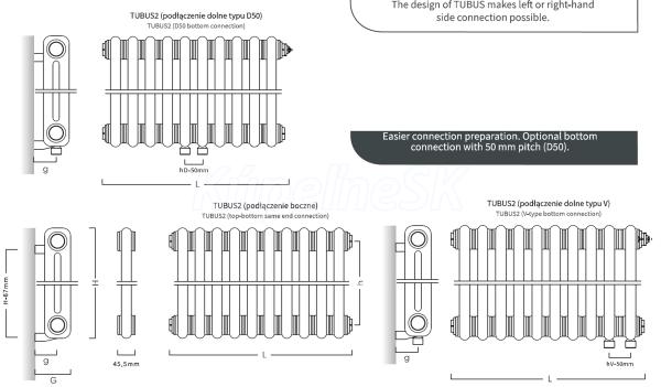 Radiátor je dodávaný ako s bočným , tak aj so spodným pripojením D50 . Pri spodnom D50 je pripojenie štandardne umiestnené v strede radiátora , ale je možné aj prípadne nechať vyrobiť s umiestnením na pravej alebo ľavej strane radiátora (nutné uviesť do objednávky)