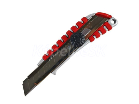 celokovové telo noža protišmyková rukoväť s plastovými výstupkami kovová vodiaca lišta skrutková aretácia šírka čepele 18 mm dva náhradné britvy v balení náhradné čepele kód:
