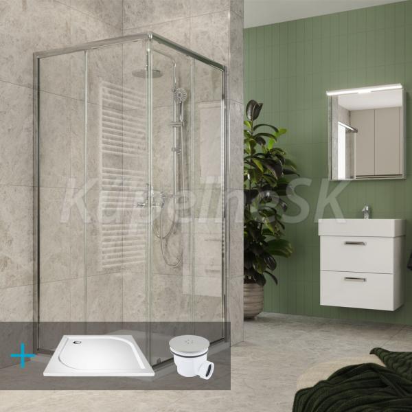 Sprchový set: sprchovací kút, 80x80x185cm, hliníkové profily, sklo číre, vanička z liateho mramoru, biela, sifón