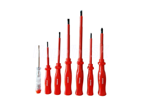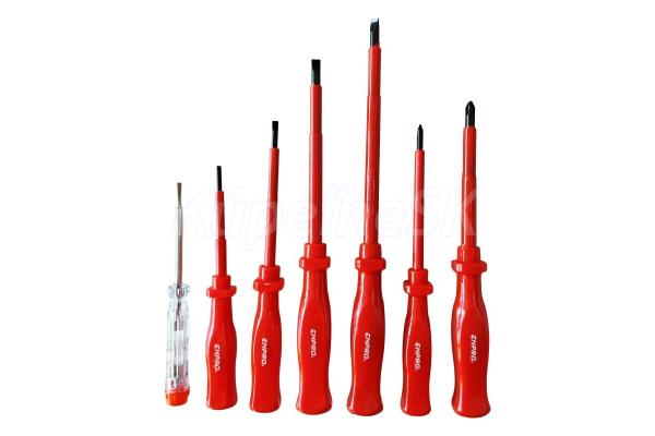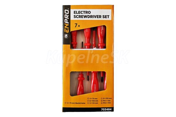 Súprava elektrických skrutkovačov ENPRO - 7 kusov certifikácia elektrických vlastností VDE 1000 V, IEC/EN 60900 - 2004 kovová tyč vyrobená z veľmi kvalitnej chromvanadiovej ocele kalený hrot je magnetický ergonomicky tvarovaná rukoväť obsah balenia: plochý skrutkovač