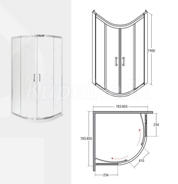 Besco Modern Chrom štvrťkruhový sprchový kút 80x80x190cm,posuvné dvere,sklo Fume rám Chróm