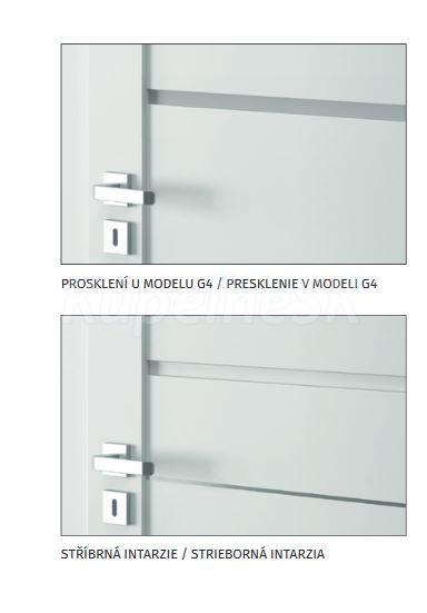 Dvere je možné zakúpiť tiež s intarziami (intarzie sú prídavné dekoratívne hliníkové pásiky na dverách). Ukážky dverí s intarziami nájdete v obrázkoch (ak máte záujem o intarzie na dverách, vyberte ich v Modeli ako Príplatok za intarzie).