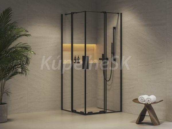 Štvordielny rohový sprchovací kút Roll v čiernom prevedení a s výplňou z číreho skla s ochrannou vrstvou Ravak AntiCalc®. Posuvný systém otvárania.