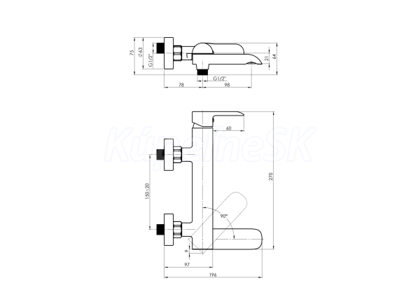 - Vaňová nástenná so sklopným výtokovým ramienkom , ktorý zároveň slúži ako prepínač