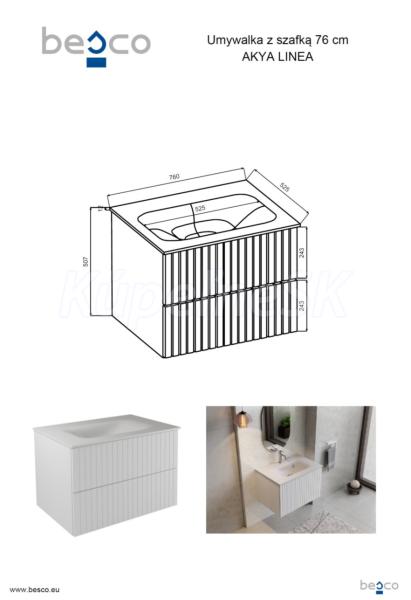 Populárny elegantný dizajn , kvalitné spracovanie a moderné frézovanie na čele šuplíka, to je naša nová séria AKYA LINEA . Súčasťou šuplíkov sú pánty s otváraním šuplíkov push-to-open (zatlačením na šuplík ho otvoríte, alebo zatvorte). Skrinky sa dodávajú vrátane elegantného umývadla z liateho mramoru a môžete si ich objednať s 3 farbami click-clack výpustí (chróm, biela a čierna matná). Možnosť dokúpiť bočnú skrinku a zrkadlo v rovnakej farbe.